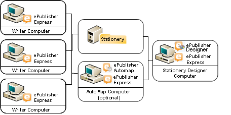 Writers install ePublisher Express on their computers. Writers use ePublisher Express to generate output using Stationery created by a Stationery designer.