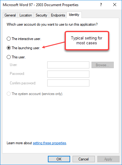 - In the Microsoft Word 97 - 2003 Document Properties dialog, select the Identity tab, then specify the user account to use to run Microsoft Word, which may or may not be a specific user depending on how you are planning to use ePublisher AutoMap.