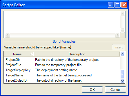 2. Double-click the variable name in the Script Variables pane to insert it. You can also type the variable name surrounded by ${}. For example, to include the project directory variable in your script, type ${ProjectDir}.