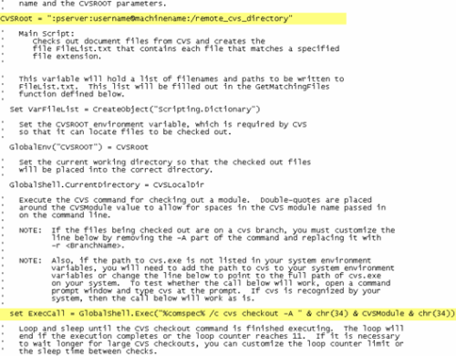 getfilesaction_cvs.vbs script includes comments to help someone with scripting experience understand the actions it performs. Since this script provides only a starting point, you need to modify this script for your environment. For example, you need to set the CVS attributes for your user name, server name, and type of authentication. You also need to adjust for how CVS is installed and called in your environment. These areas of the script are highlighted in the following figure:The following figure shows an example of how to call the
