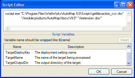 getfilesaction_cvs.vbs, which is installed with ePublisher AutoMap. By default, this script is located in the following location:\Program Files\WebWorks\ePublisher AutoMap\Scripts\getfilesaction_cvs.vbsThe