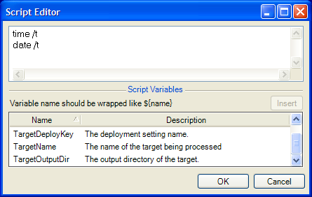 This example simply displays the time and date in the log file by calling the time and date commands built into the DOS command-line interface. In this case, the script was added as a pre-build step for the job running before the first target starts generating output.