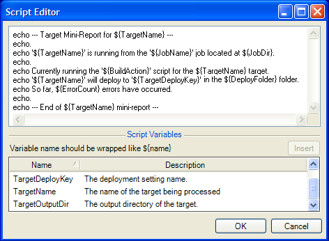 This example creates a simple mini-report inside the log file for each target in the job. This simple example demonstrates the use of the scripting variables. In this case, the values of the variables are displayed as part of the report using the echo command built into the DOS command-line interface.