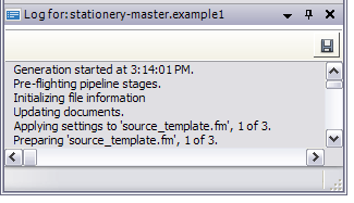 The Log Window is available in both ePublisher Express and ePublisher Designer. The Log Window displays the log ePublisher creates when generating output. When ePublisher creates a log during output generation, you can see the status of the output generation process and any errors generated. You can also quickly and easily see which pipelines ePublisher processed, which settings ePublisher applied, and which files ePublisher parsed. For more information about viewing or working with logs, see the Working with Output Log Files.The following figure shows the Log Window.
