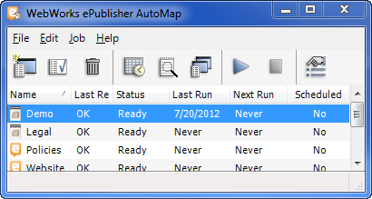 The ePublisher AutoMap user interface allows you to create, edit, and schedule ePublisher AutoMap jobs. The following figure shows the ePublisher AutoMap user interface.