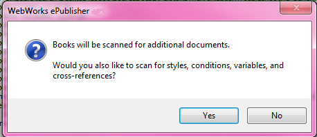 By default, ePublisher will automatically scan your documents, thus making sure any new styles, conditions, variables, etc. are added to your project.
