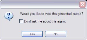 - If you want ePublisher to automatically open the output each time you generate output and you do not want ePublisher to ask you each time if you want to view the generated output, select the Don't ask me about this again check box, and then click Yes.